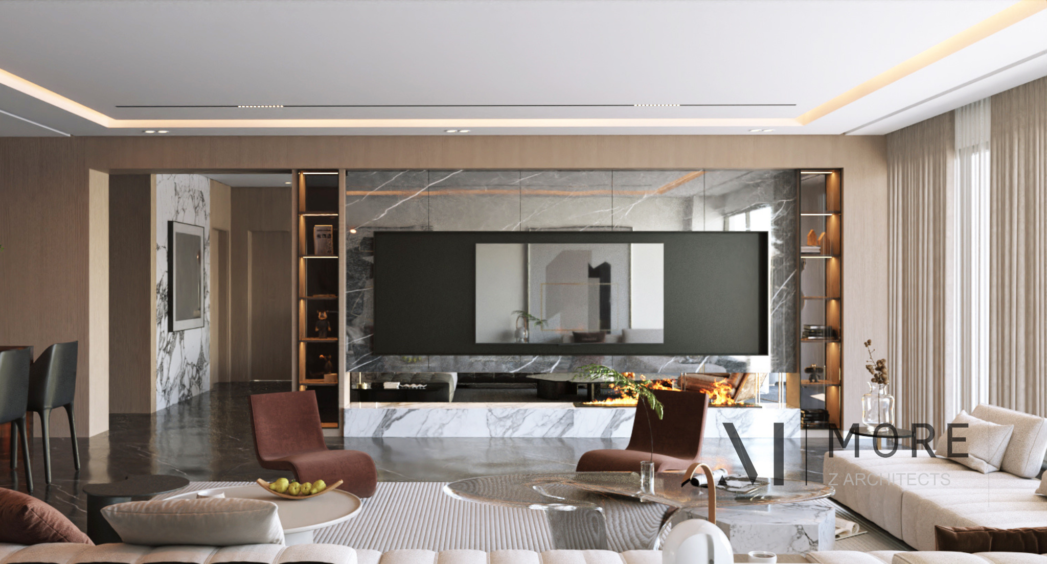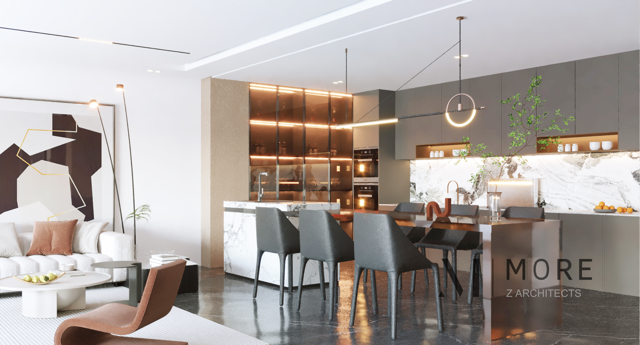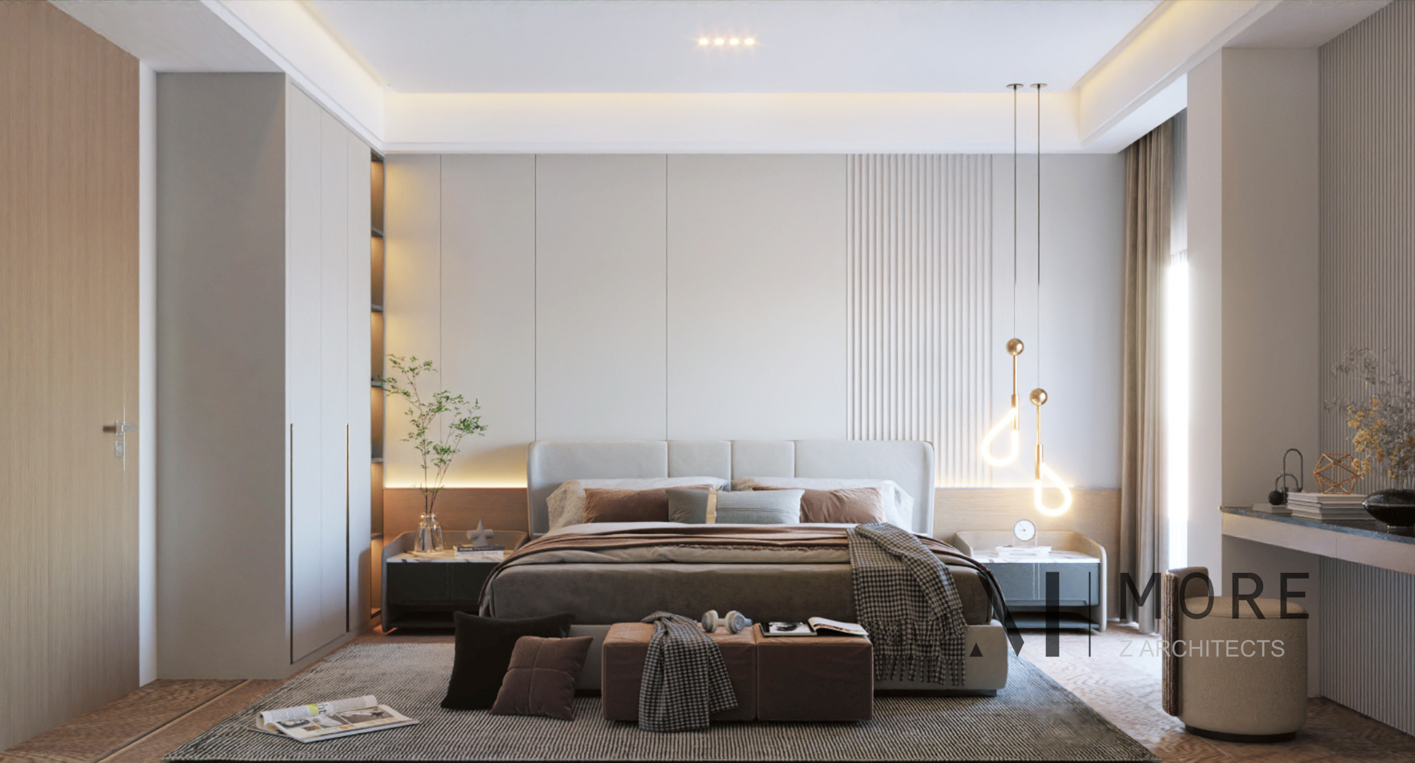 In accordance with our practice, the design is modern, minimalist, focusing on quality as well as sophistication, and materials are basic: painted plaster, glass and wood. The vision is to provide a light-flooded space with natural ventilation and thus save energy, thanks to the installation of large bay windows that allow in natural light to bathe the interior rooms in all seasons. Each part virtually has no need to be lit during the day. The use of glazing on facades strengthens the relationship between interior and exterior and beyond the pleasure of seeing the building covered with light, there is also the important fact of saving electricity and wasting less energy while thinking about the environment. Design is a game with volumes and cubes. The floor seems to float on the lower volume, these perfectly fitted out living spaces.