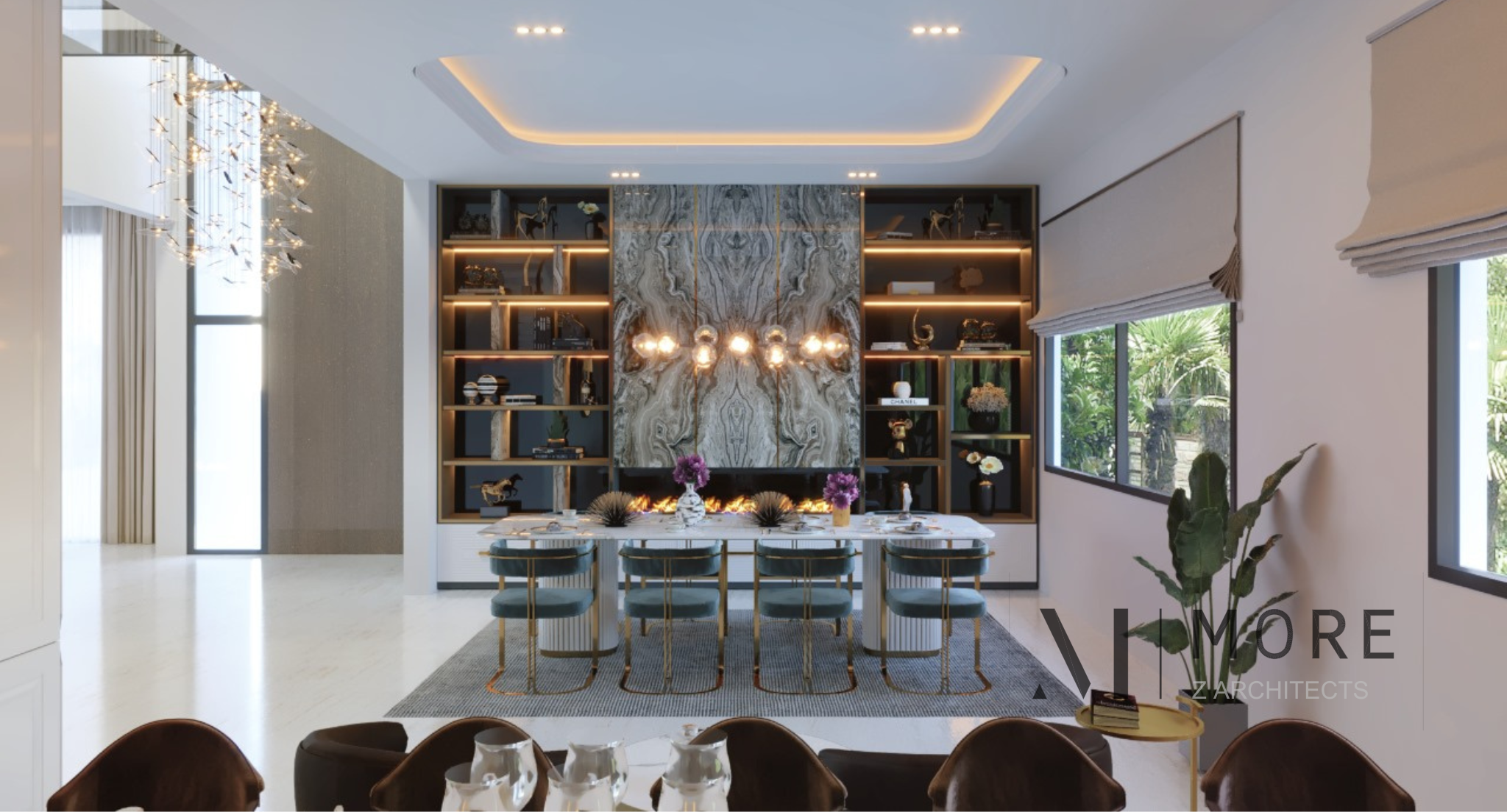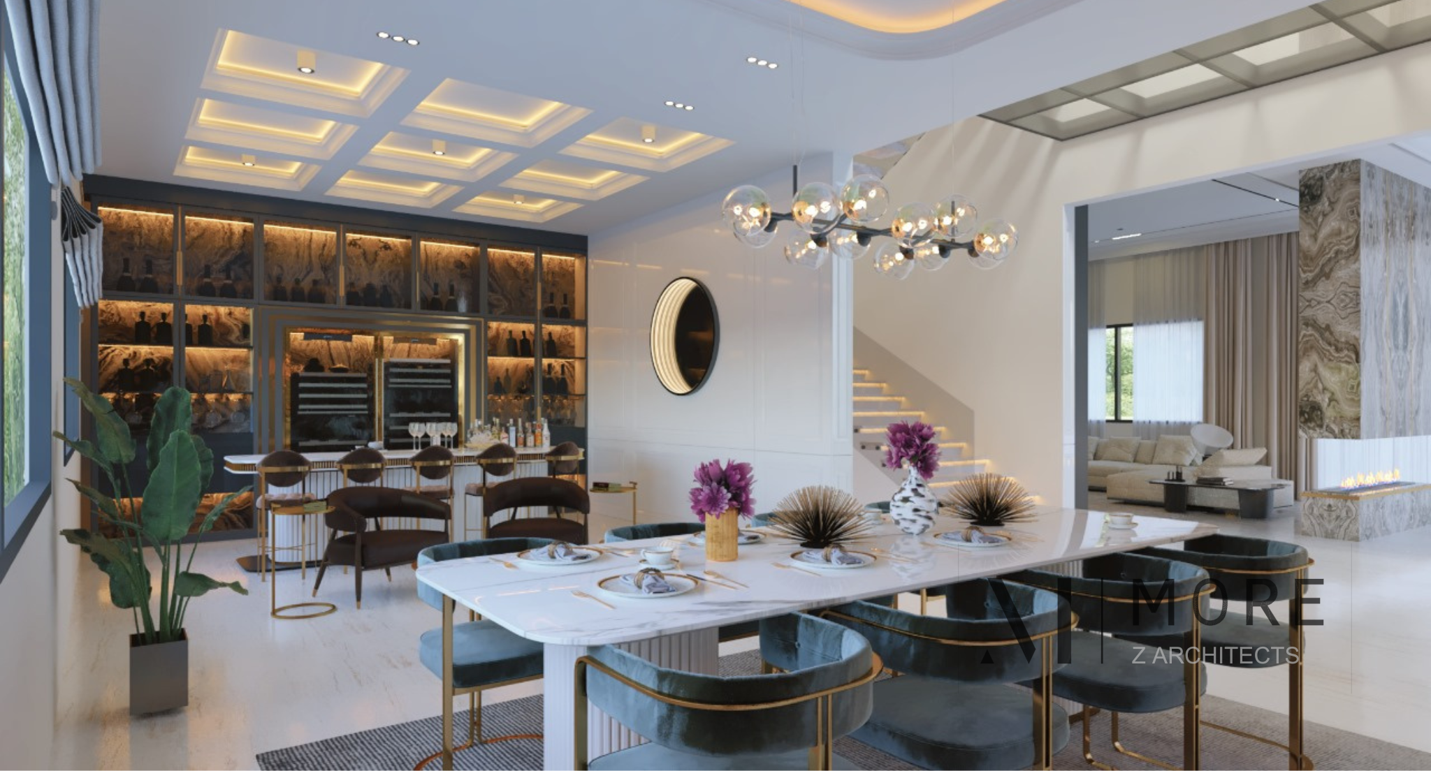 In accordance with our practice, the design is modern, minimalist, focusing on quality as well as sophistication, and materials are basic: painted plaster, glass and wood. The vision is to provide a light-flooded space with natural ventilation and thus save energy, thanks to the installation of large bay windows that allow in natural light to bathe the interior rooms in all seasons. Each part virtually has no need to be lit during the day. The use of glazing on facades strengthens the relationship between interior and exterior and beyond the pleasure of seeing the building covered with light, there is also the important fact of saving electricity and wasting less energy while thinking about the environment. Design is a game with volumes and cubes. The floor seems to float on the lower volume, these perfectly fitted out living spaces.