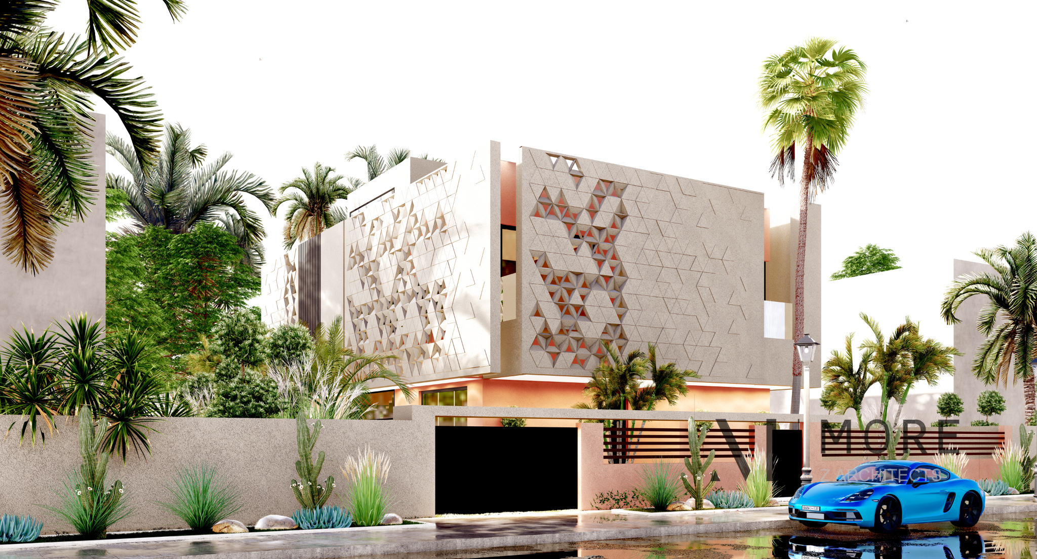 Conformément à notre pratique, le design est moderne, minimaliste, axé sur la qualité ainsi que la sophistication, et les matériaux sont basiques : plâtre peint, verre et bois. La vision est de fournir un espace baigné de lumière avec une ventilation naturelle et ainsi économiser l'énergie, grâce à l'installation de grandes baies vitrées qui permettent à la lumière naturelle de baigner les pièces intérieures en toutes saisons. Chaque partie n'a pratiquement pas besoin d'être éclairée pendant la journée. L'utilisation de vitrage sur les façades renforce la relation entre l'intérieur et l'extérieur et au-delà du plaisir de voir le bâtiment couvert de lumière, il y a aussi le fait important d'économiser l'électricité et de gaspiller moins d'énergie tout en pensant à l'environnement. Le design est un jeu avec les volumes et les cubes. Le sol semble flotter sur le volume inférieur, ces espaces de vie parfaitement aménagés.