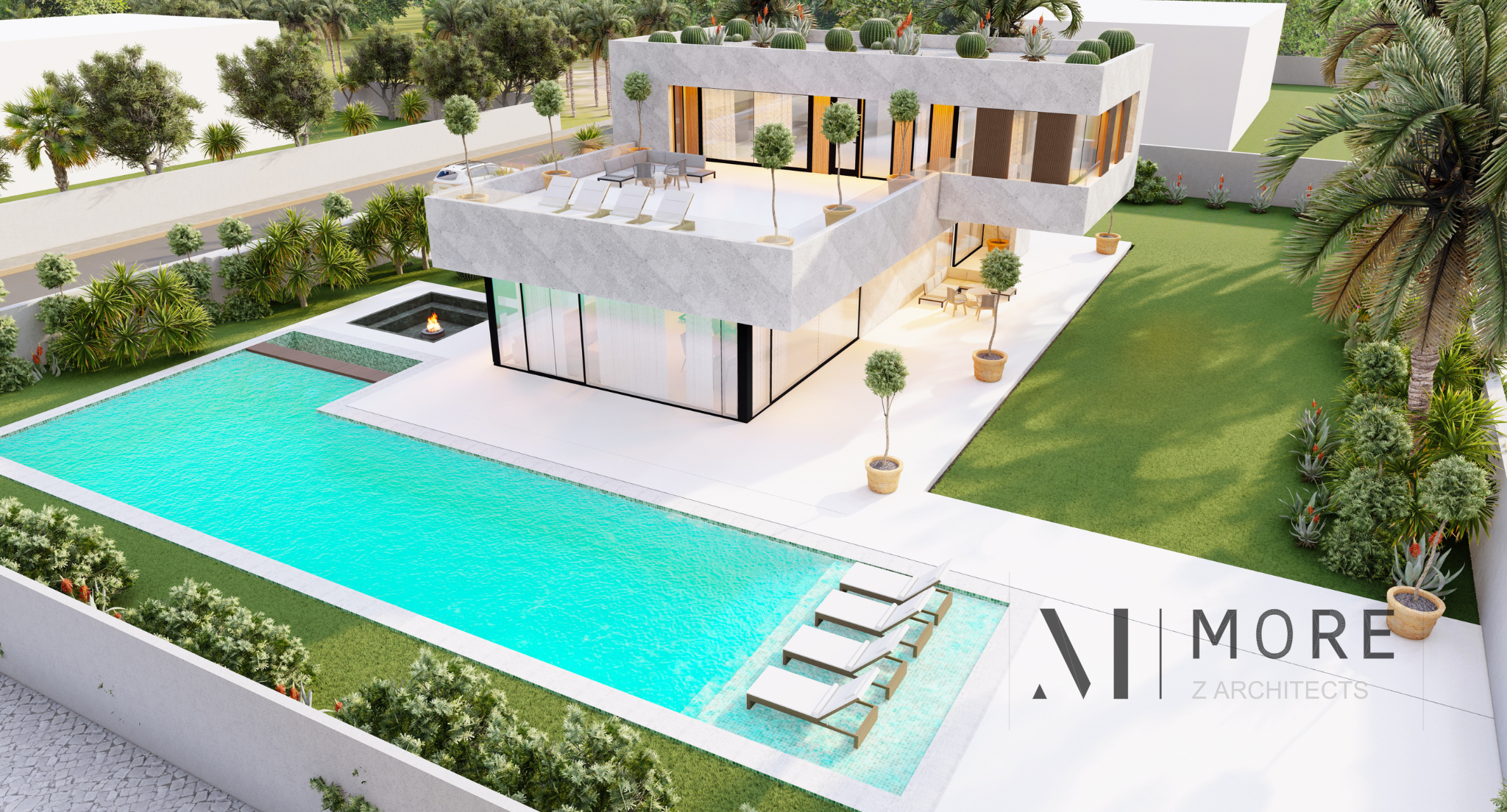 Conformément à notre pratique, le design est moderne, minimaliste, axé sur la qualité ainsi que la sophistication, et les matériaux sont basiques : plâtre peint, verre et bois. La vision est de fournir un espace baigné de lumière avec une ventilation naturelle et ainsi économiser l'énergie, grâce à l'installation de grandes baies vitrées qui permettent à la lumière naturelle de baigner les pièces intérieures en toutes saisons. Chaque partie n'a pratiquement pas besoin d'être éclairée pendant la journée. L'utilisation de vitrage sur les façades renforce la relation entre l'intérieur et l'extérieur et au-delà du plaisir de voir le bâtiment couvert de lumière, il y a aussi le fait important d'économiser l'électricité et de gaspiller moins d'énergie tout en pensant à l'environnement. Le design est un jeu avec les volumes et les cubes. Le sol semble flotter sur le volume inférieur, ces espaces de vie parfaitement aménagés.