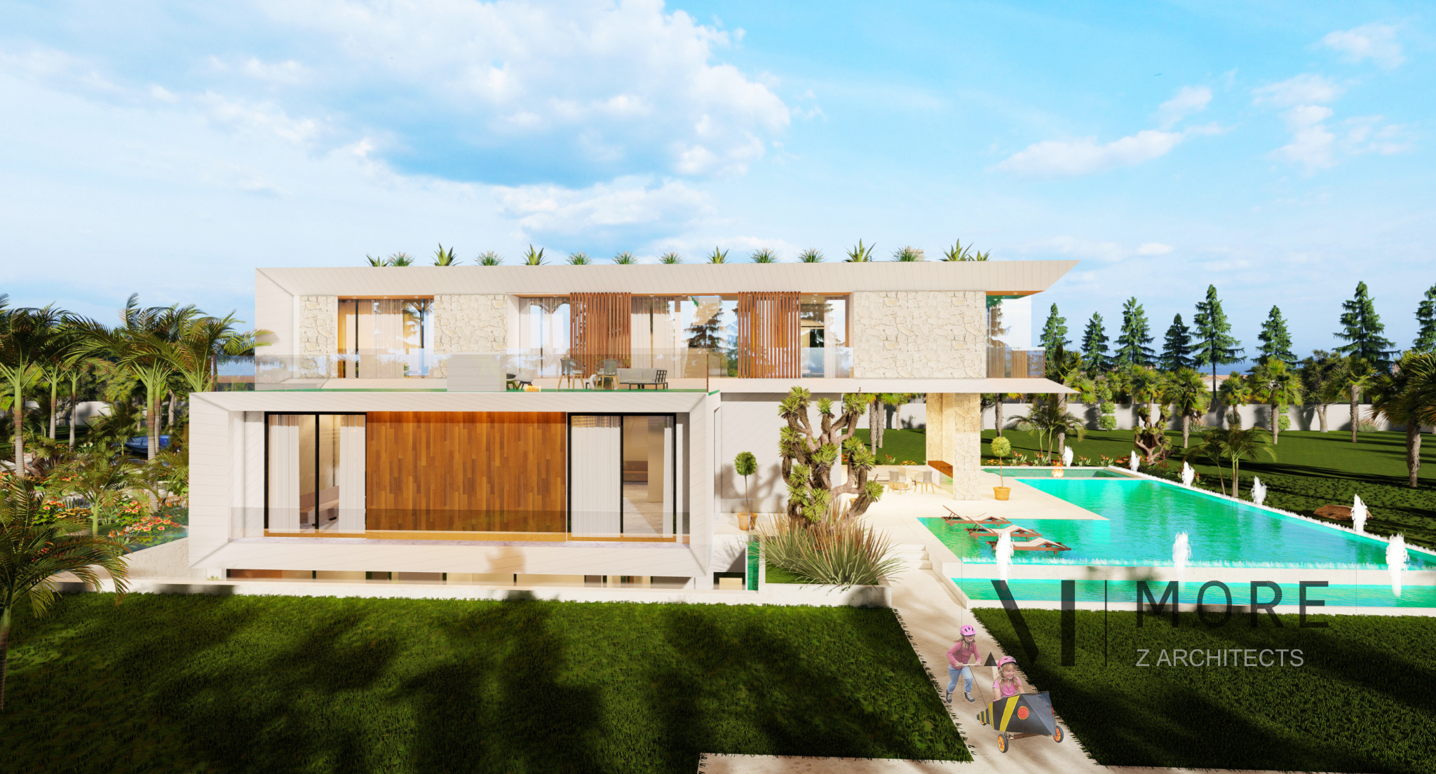 Conformément à notre pratique, le design est moderne, minimaliste, axé sur la qualité ainsi que la sophistication, et les matériaux sont basiques : plâtre peint, verre et bois. La vision est de fournir un espace baigné de lumière avec une ventilation naturelle et ainsi économiser l'énergie, grâce à l'installation de grandes baies vitrées qui permettent à la lumière naturelle de baigner les pièces intérieures en toutes saisons. Chaque partie n'a pratiquement pas besoin d'être éclairée pendant la journée. L'utilisation de vitrage sur les façades renforce la relation entre l'intérieur et l'extérieur et au-delà du plaisir de voir le bâtiment couvert de lumière, il y a aussi le fait important d'économiser l'électricité et de gaspiller moins d'énergie tout en pensant à l'environnement. Le design est un jeu avec les volumes et les cubes. Le sol semble flotter sur le volume inférieur, ces espaces de vie parfaitement aménagés.