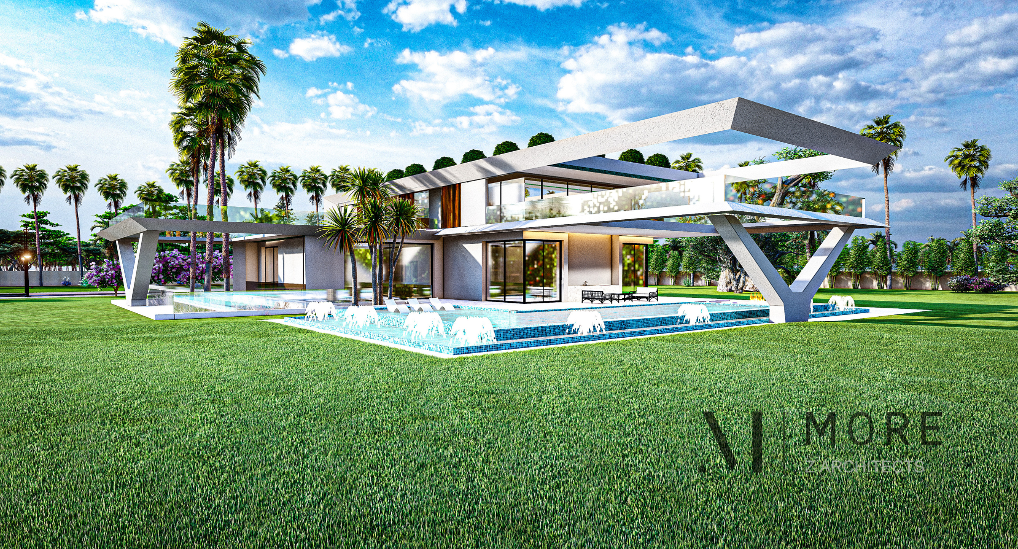 Conformément à notre pratique, le design est moderne, minimaliste, axé sur la qualité ainsi que la sophistication, et les matériaux sont basiques : plâtre peint, verre et bois. La vision est de fournir un espace baigné de lumière avec une ventilation naturelle et ainsi économiser l'énergie, grâce à l'installation de grandes baies vitrées qui permettent à la lumière naturelle de baigner les pièces intérieures en toutes saisons. Chaque partie n'a pratiquement pas besoin d'être éclairée pendant la journée. L'utilisation de vitrage sur les façades renforce la relation entre l'intérieur et l'extérieur et au-delà du plaisir de voir le bâtiment couvert de lumière, il y a aussi le fait important d'économiser l'électricité et de gaspiller moins d'énergie tout en pensant à l'environnement. Le design est un jeu avec les volumes et les cubes. Le sol semble flotter sur le volume inférieur, ces espaces de vie parfaitement aménagés.